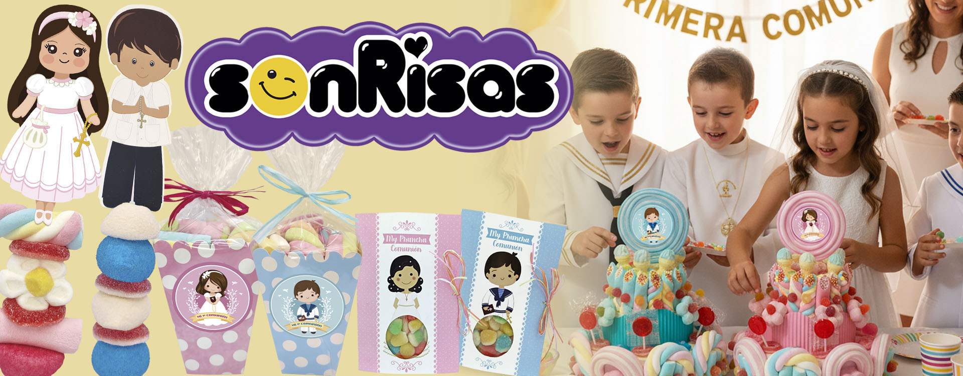 Pincho formado con figuras de marshmallow, bolas de golf y goma dulce, decorado con un litografiado del dia de la madre
