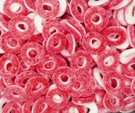 Gomitas dulces y sabrosas, con forma de aro, de color rojo y blanco, ideales para decorar tartas y mesas dulces, perfectas para fiestas y celebraciones.