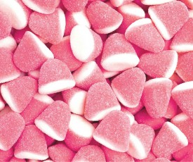 Gomitas dulces y sabrosas, de color rosa y blanco, ideales para decorar tartas y mesas dulces, perfectas para fiestas y celebraciones.
