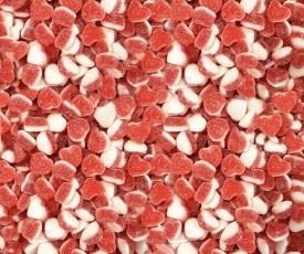 Gomitas dulces y sabrosas, con forma de corazón, de color rojo y blanco, ideales para decorar tartas y mesas dulces, perfectas para fiestas y celebraciones.
