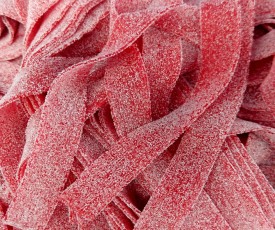 Gomitas dulces y sabrosas, con forma de cinta, de color rojo y sabor a fresa, ideales para decorar tartas y mesas dulces, perfectas para fiestas y celebraciones.
