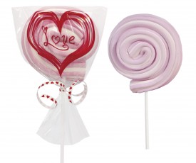 Piruleta de marshmallow de color rosa y blanco, envuelta en bolsa de plástico transparente, decorada con una pegatina con forma de corazón y la palabra "LOVE", atada con lazo blanco y corazones rojos.