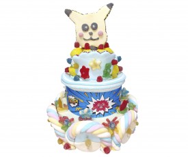 Tarta de marshmallow y gomas dulces, con una base redonda y una figura con forma de perrito. Todo ello cubierto con marshmallow y gomas dulces de diferentes formas, colores y sabores.