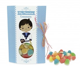 Tarrina llena de marshmallow y gomas dulces, embolsada y decorada con tarjeta 1ª Comunión niño