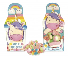 Cajita litografiada con motivos de unicornios, con ventana, llena de marshmallow y gomas dulces