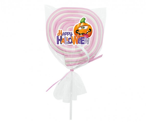 Piruleta de marshmallow con forma de espiral, decorada con pegatina de halloween