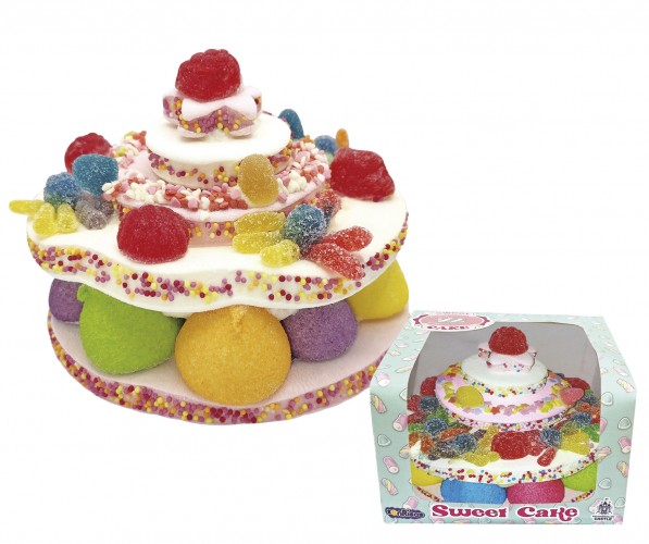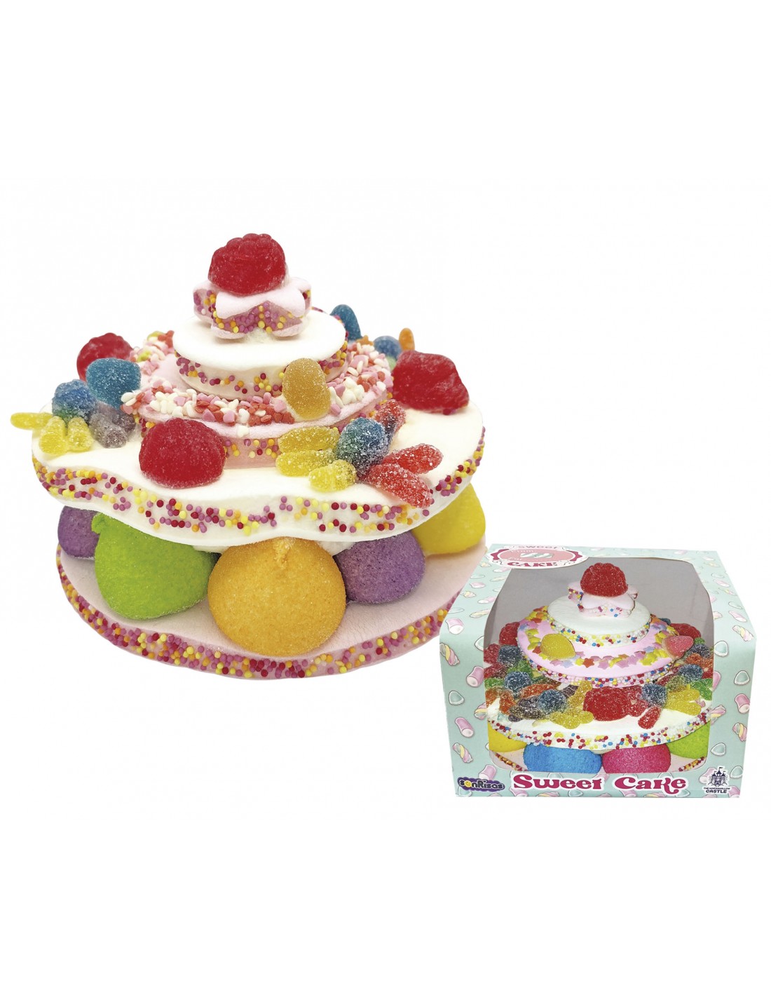 Tarta de marshmallow y goma dulce, con frase "Feliz Cumpleaños"
