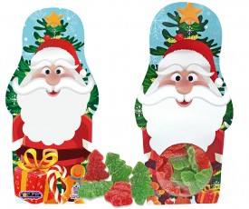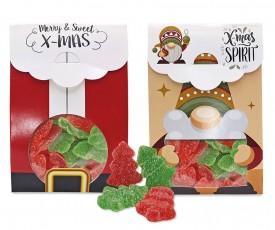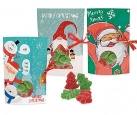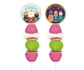 Pincho formado por marshmallow y gomas dulces, decorado con un cartoncillo con dibujos navideños. Salvo que se especifique en observaciones que dibujo quiere, mandaremos una al azar.