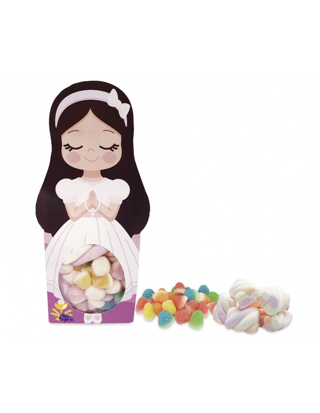 Cajita con forma de niña de Comunión, llena de goma dulce y marshmallow