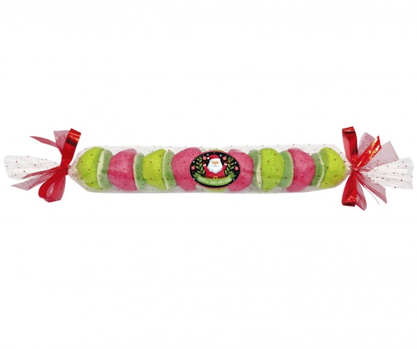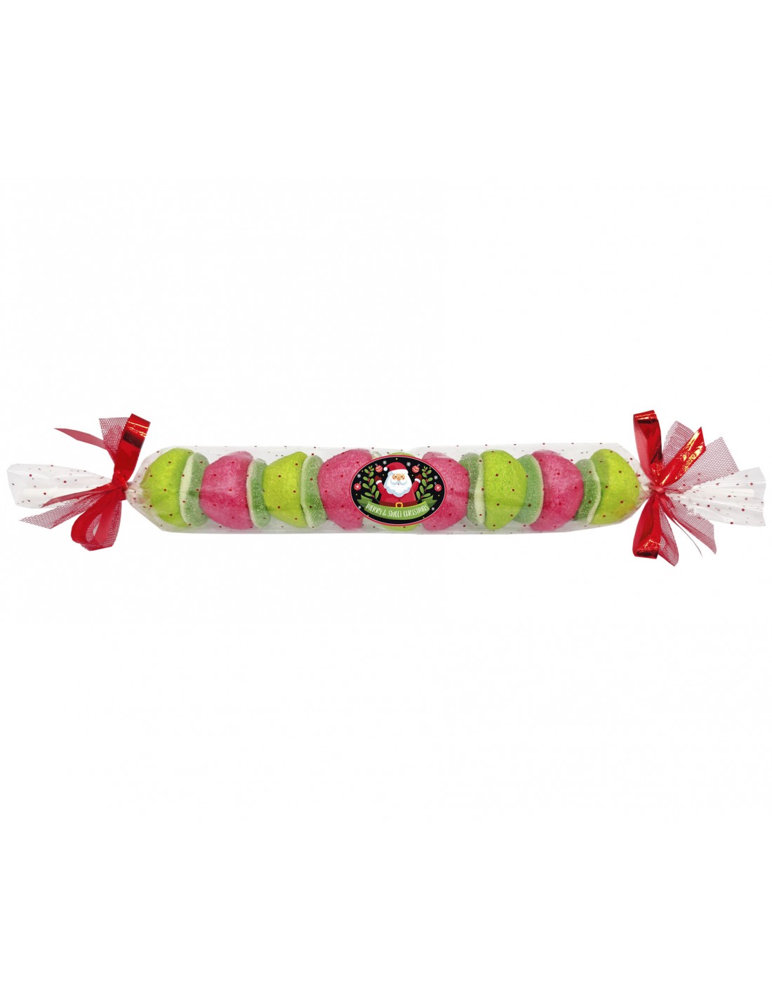 Brocheta formada por marshmallow y gomas dulces, decorada con pegatina navideña y lazos de tela rojos