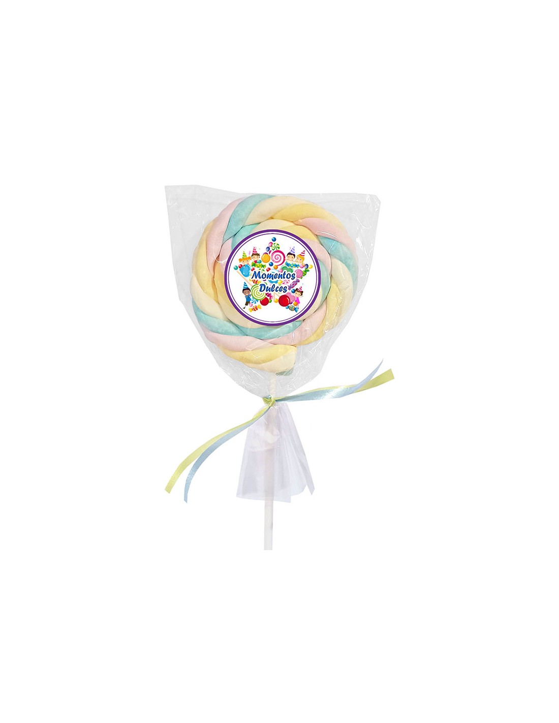 Pincho formado por marshmallow y gomas dulces, envuelto en bolsa transparente y cerrado con lazos de colores. Decorado con un litografiado publicitario