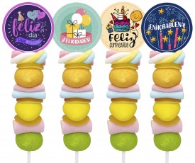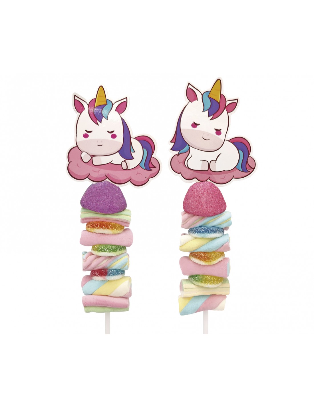 Brocheta formada por marshmallow y gomas dulces, decorada con un unicornio de cartón.