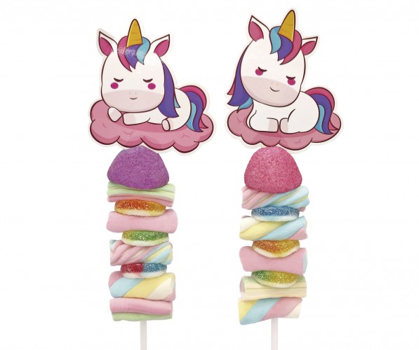 Brocheta formada por marshmallow y gomas dulces, decorada con un unicornio de cartón