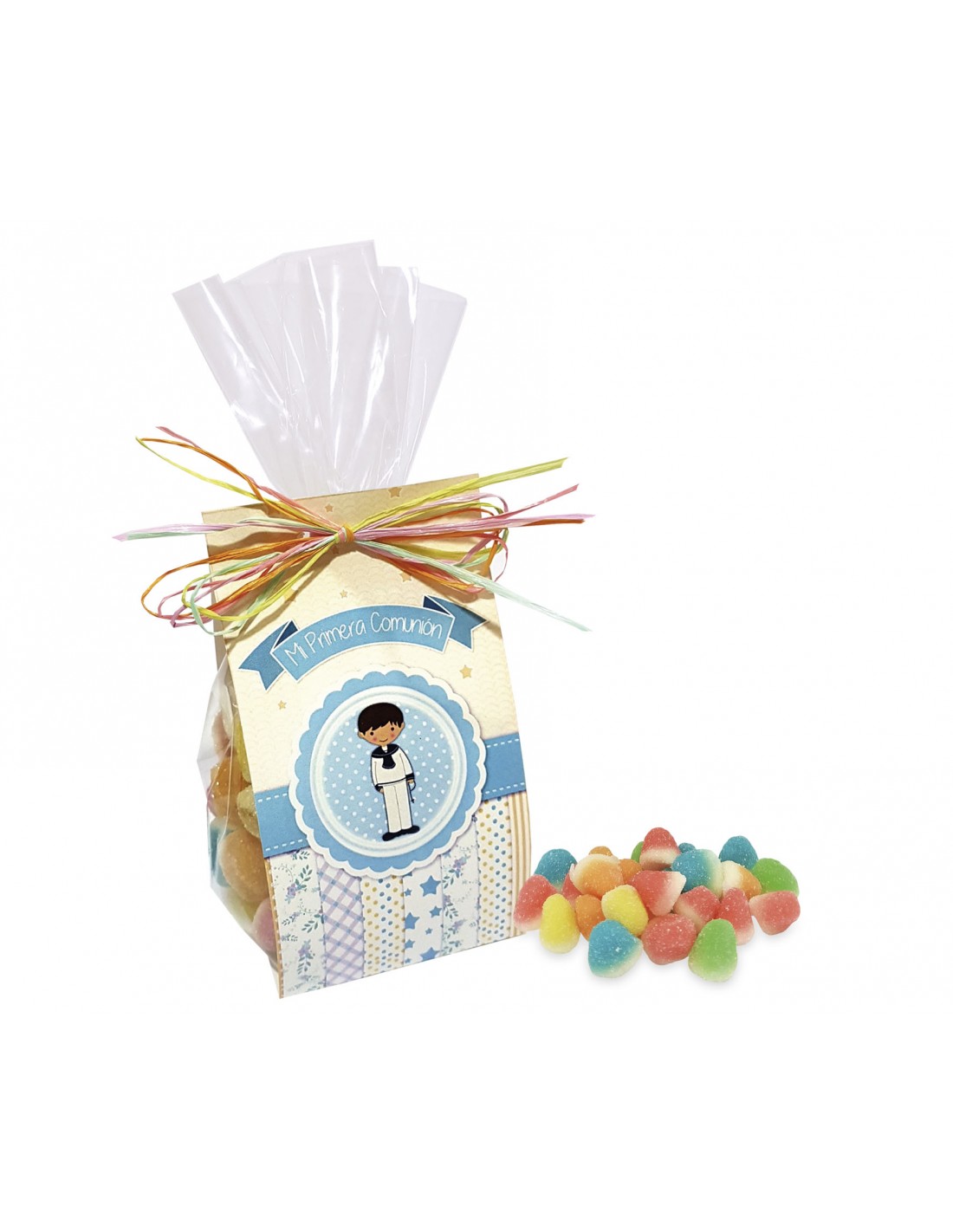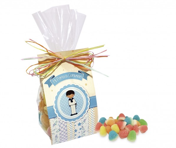 Bolsa llena de gomas dulces, decorada con un cartoncillo con dibujos de Niño Comunión y cerrada con un lazo de rafia