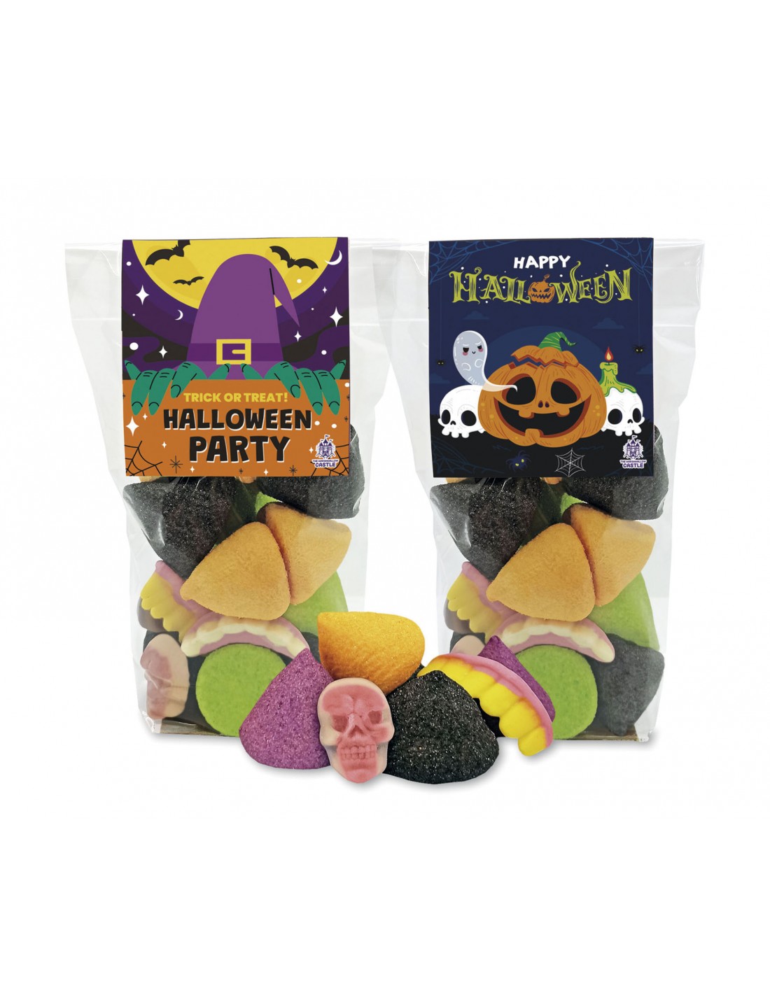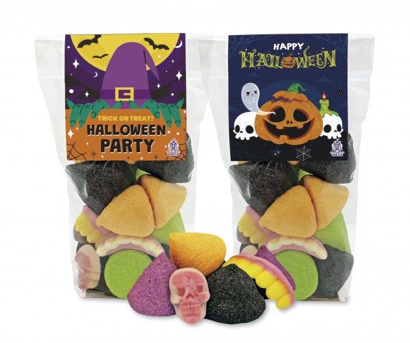 Bote transparente con pegatina decorativa de Halloween, lleno de gomas dulces con forma de hueso, bruja, calavera, calabaza y dentadura de vampiro.