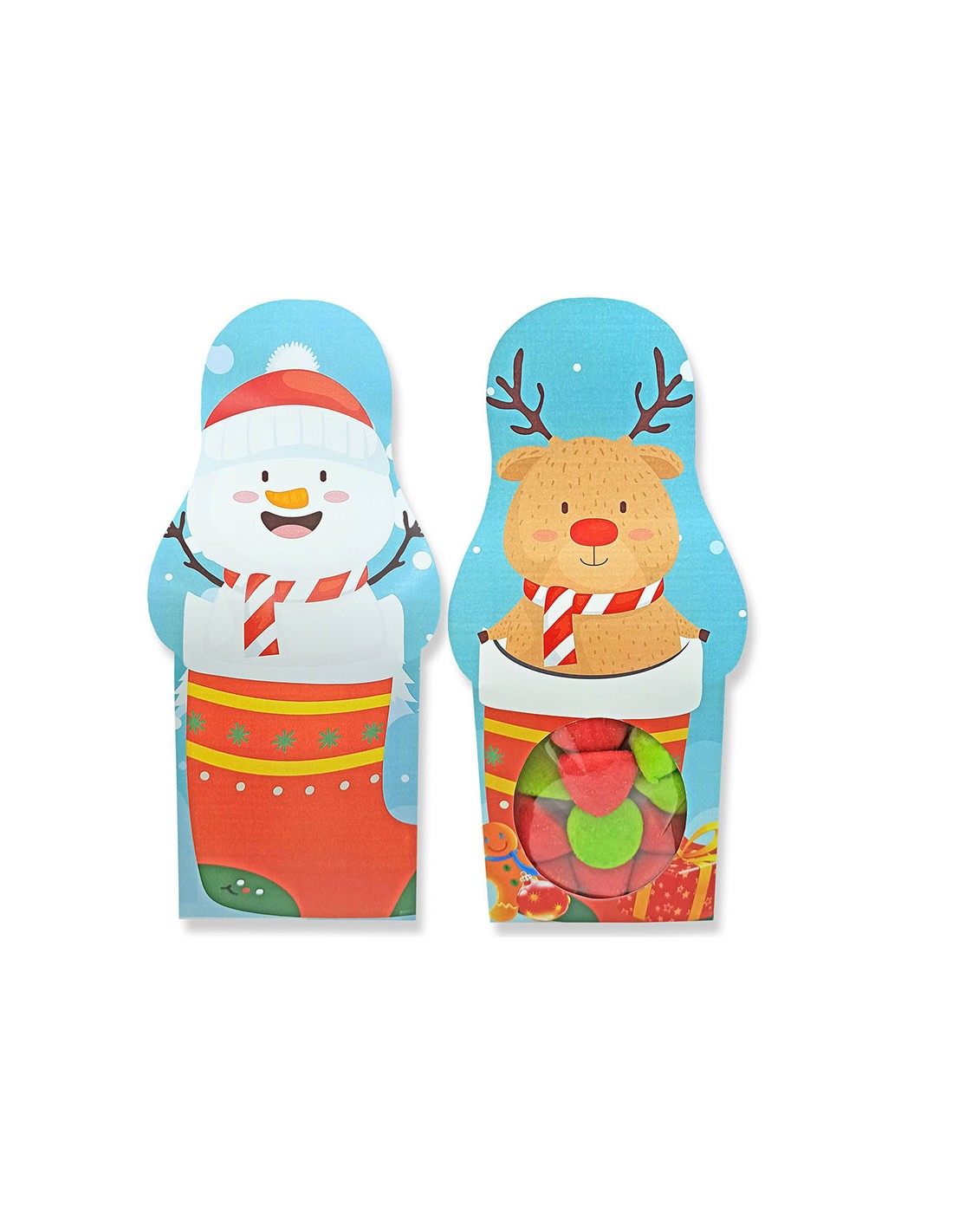 Cajita decorada de navidad, con ventana, llena de bolas de marshmallow rojas y verdes