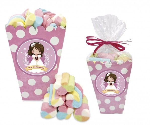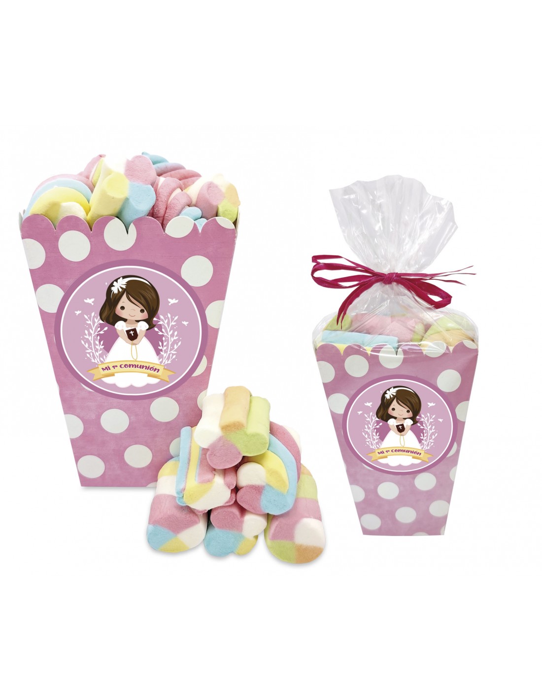Cubo de cartón de color rosa con puntitos blancos, decorado con un dibujo de niña de comunión, lleno de marshmallow, envuelto en bolsa transparente y atada con lazo de rafia rosa.