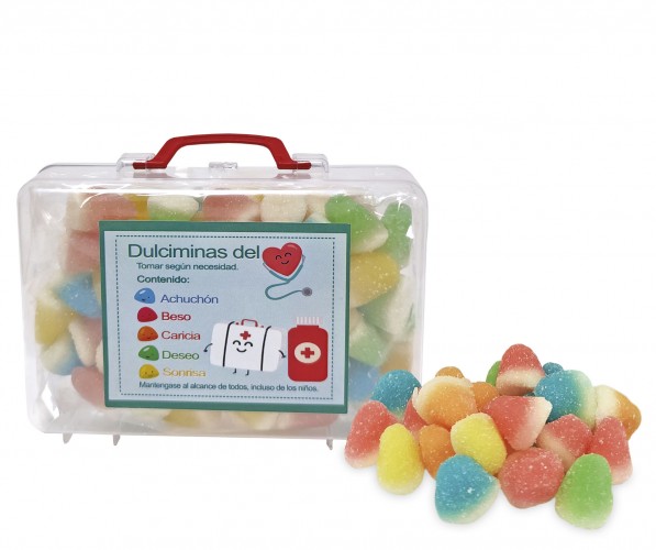 Pequeña maleta de plástico transparente, llena de gomas dulces de diferentes colores y sabores, decorada con una pegatina con mensajes graciosos, recomendando según tus deseos una goma dulce de un color determinado.