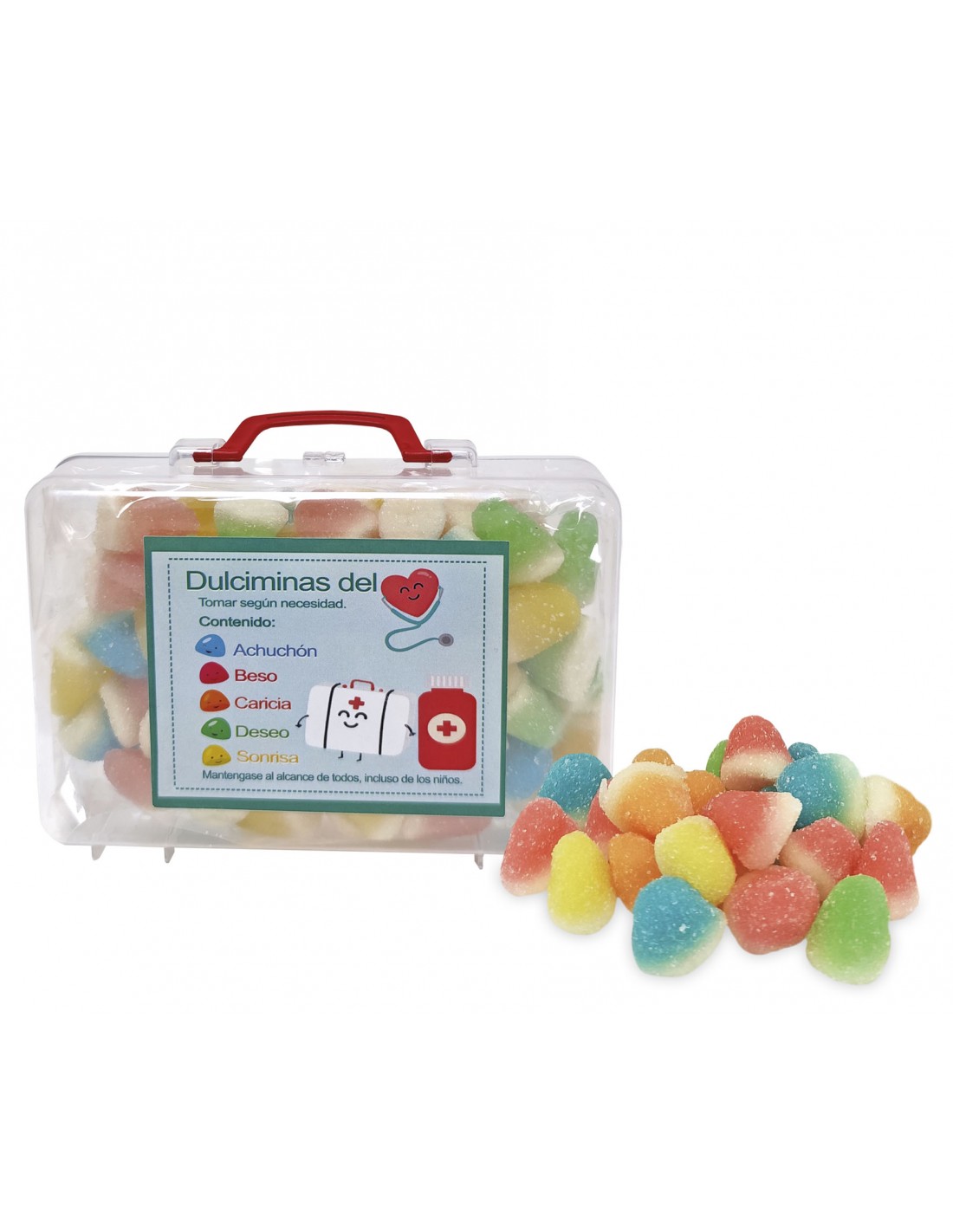 Pequeña maleta de plástico transparente, llena de gomas dulces de diferentes colores y sabores, decorada con una pegatina con mensajes graciosos, recomendando según tus deseos una goma dulce de un color determinado.