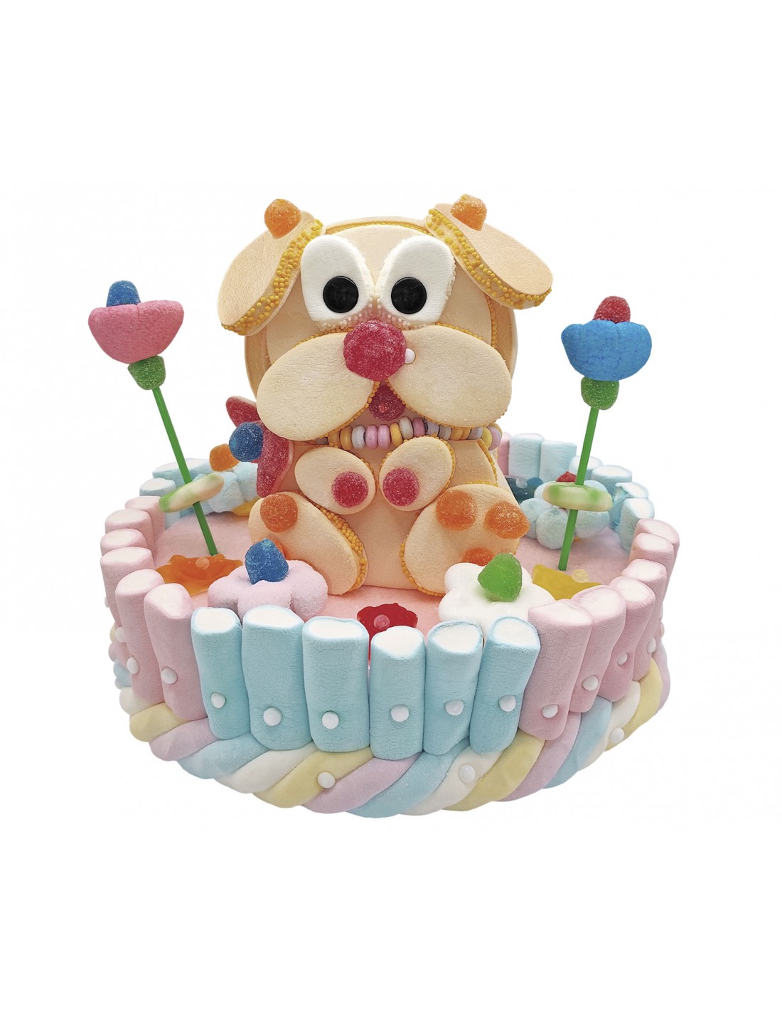 Tarta de marshmallow y gomas dulces, esta formada por una base redonda, rodeada de marshmallow de colores variados, sobre la base lleva una figura con forma de perrito que esta formada por marshmallow de color naranja, gomas dulces y un collar de caramelo. Sobre la base y alrededor del perrito esta decorado con flores de marshmallow y gomas dulces de varias formas, colores y sabores.