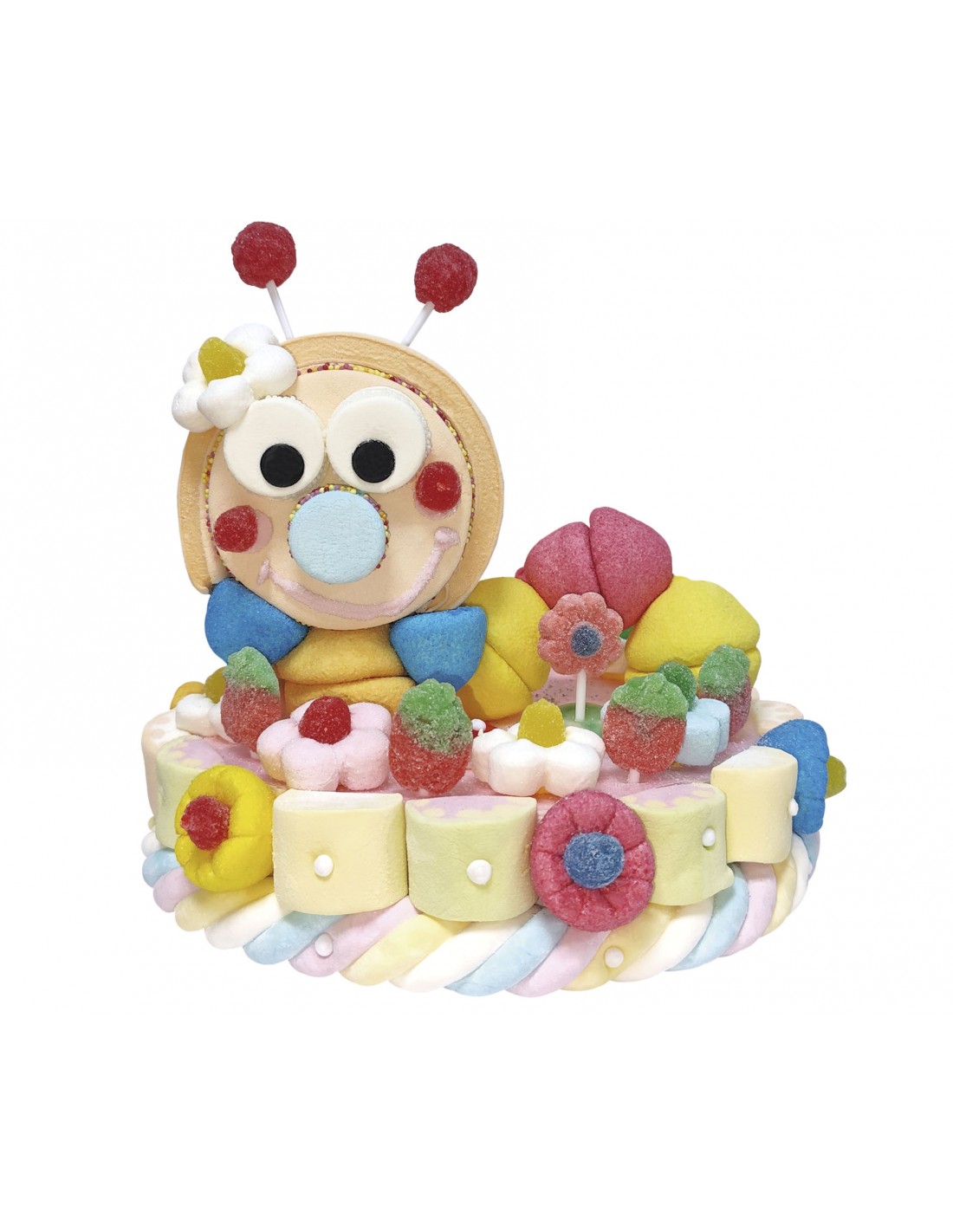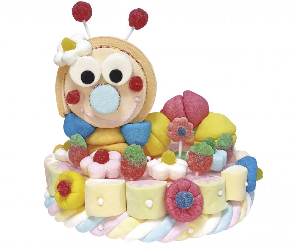Tarta de marshmallow y gomas dulces, esta formada por una base redonda, rodeada de marshmallow de colores variados, sobre la base lleva una figura con forma de gusano que esta formada por marshmallow de color naranja y gomas dulces. Sobre la base y alrededor del gusano esta decorado con flores de marshmallow y gomas dulces de varias formas, colores y sabores.