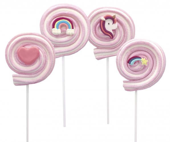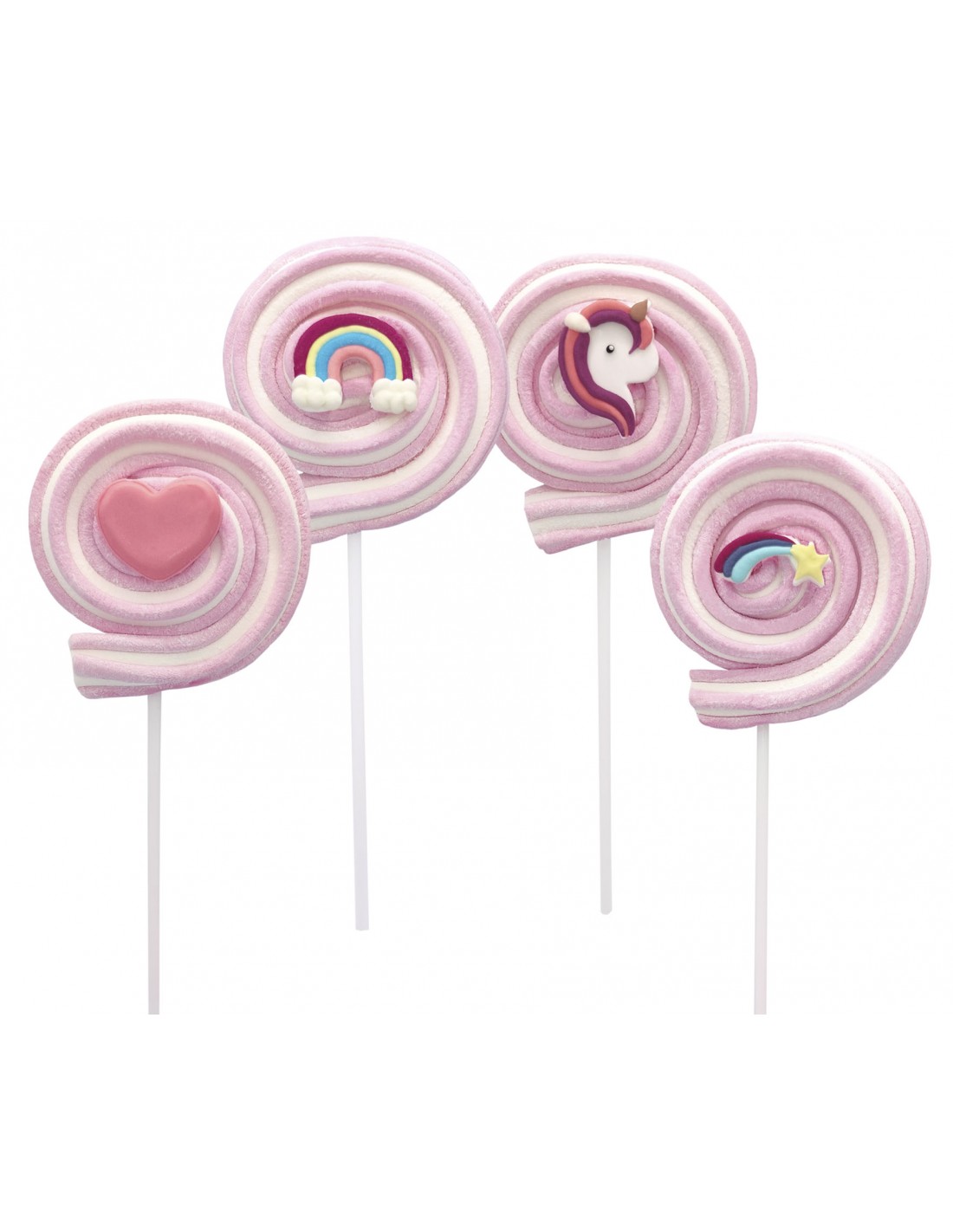Piruleta de marshmallow rosa y blanco, con forma de espiral y decorado con una figurita de azúcar con formas variadas, arco iris, unicornio, corazón y estrella fugaz, envuelto en bolsa transparente y atada con lazos multicolor. Especificar en observaciones el modelo que desee.