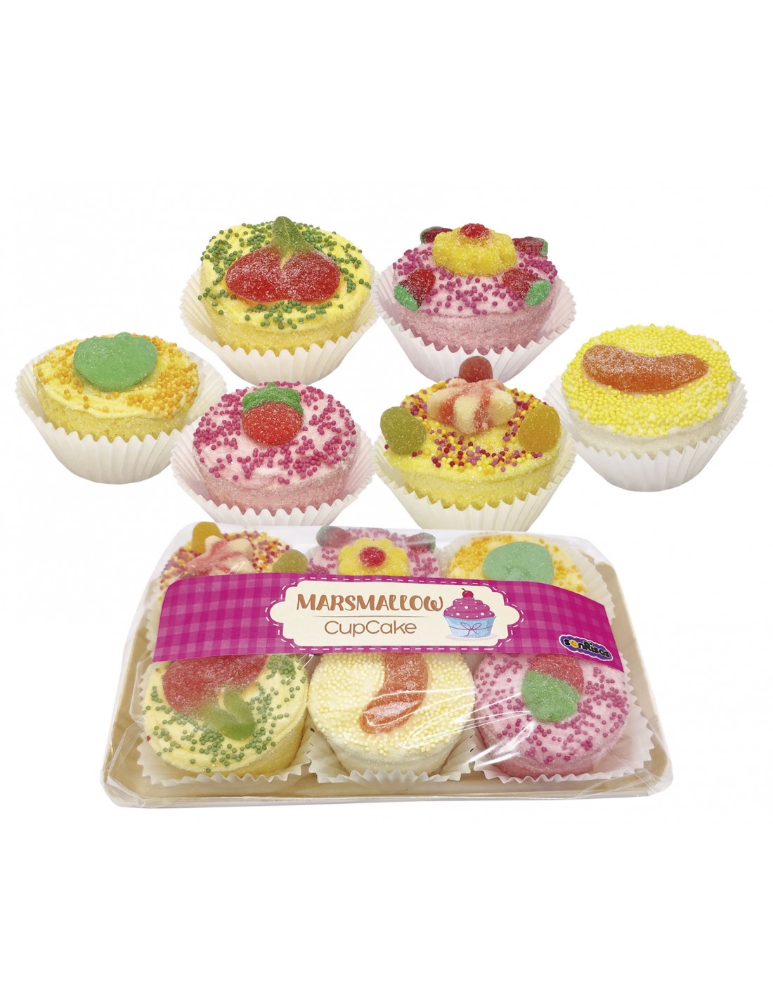 Bandeja con seis Cupcake de marshmallow y gomas dulces, de diferentes colores y sabores, envuelta en plástico transparente y decorada con una pegatina.