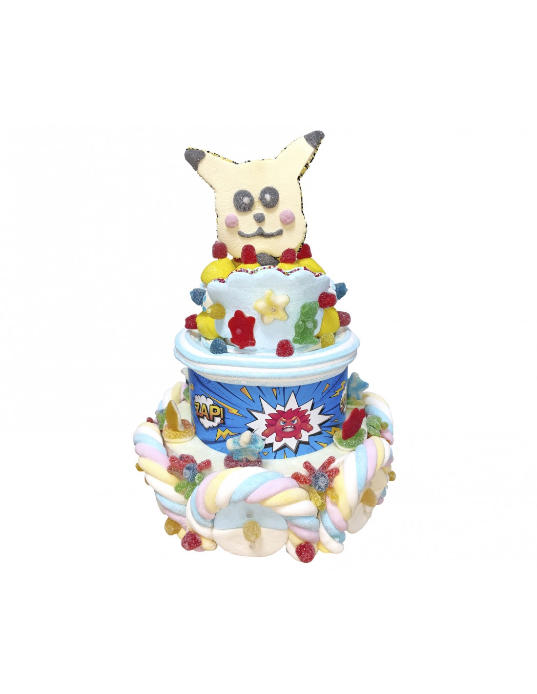 Tarta de marshmallow y gomas dulces, tiene tres alturas, la del centro lleva una cenefa de cartón con dibujos de personajes infantiles, sobre la ultima altura hay una silueta de marshmallow, caracterizada como un personaje de dibujos. Ideal para fiestas con niños.