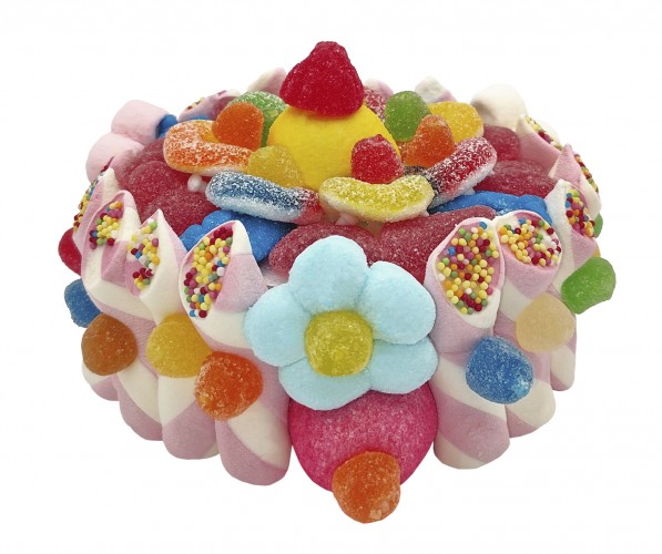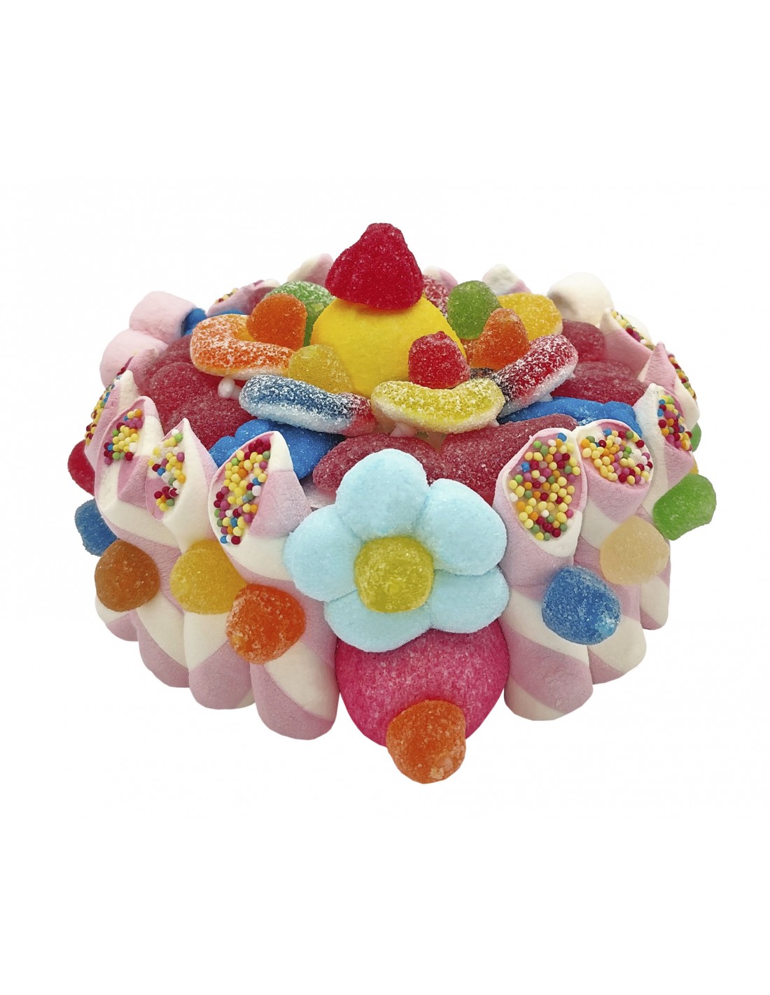 Tarta de marshmallow y gomas dulces, en caja decorada, con ventana transparente. El interior es de poliespán.