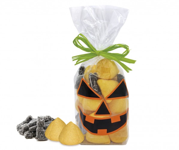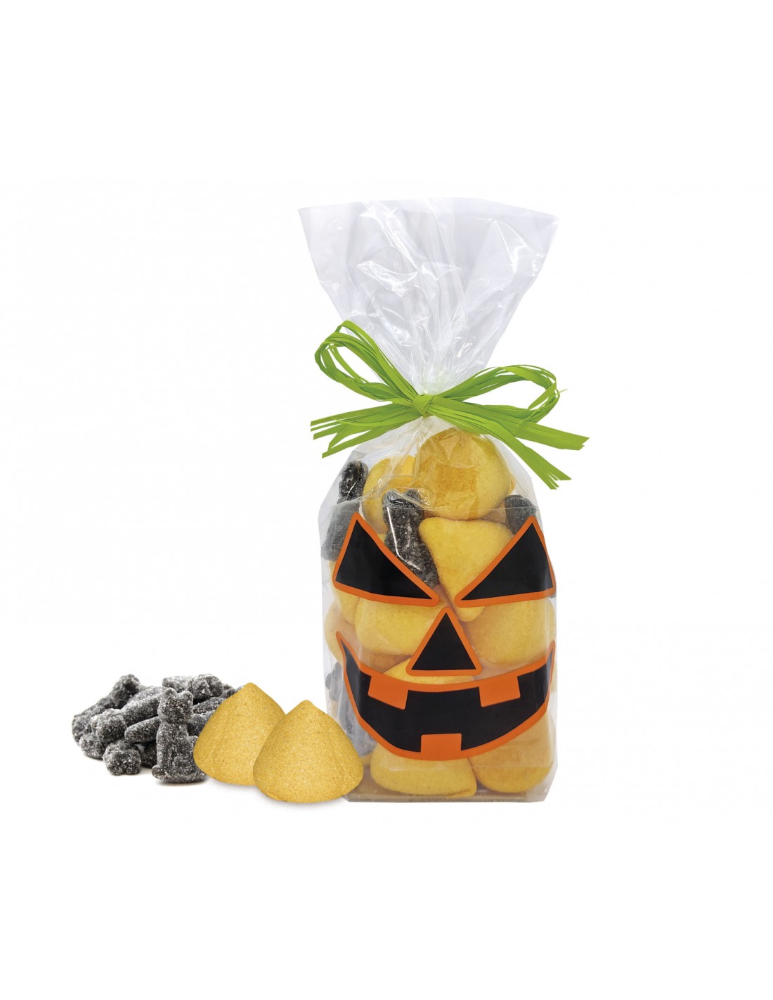 Bolsa transparente llena de marshmallow de color naranja y gomas dulces, con forma de gato y de color negro, cerrada con lazo de rafia verde y decorada con pegatinas para que parezca una calabaza