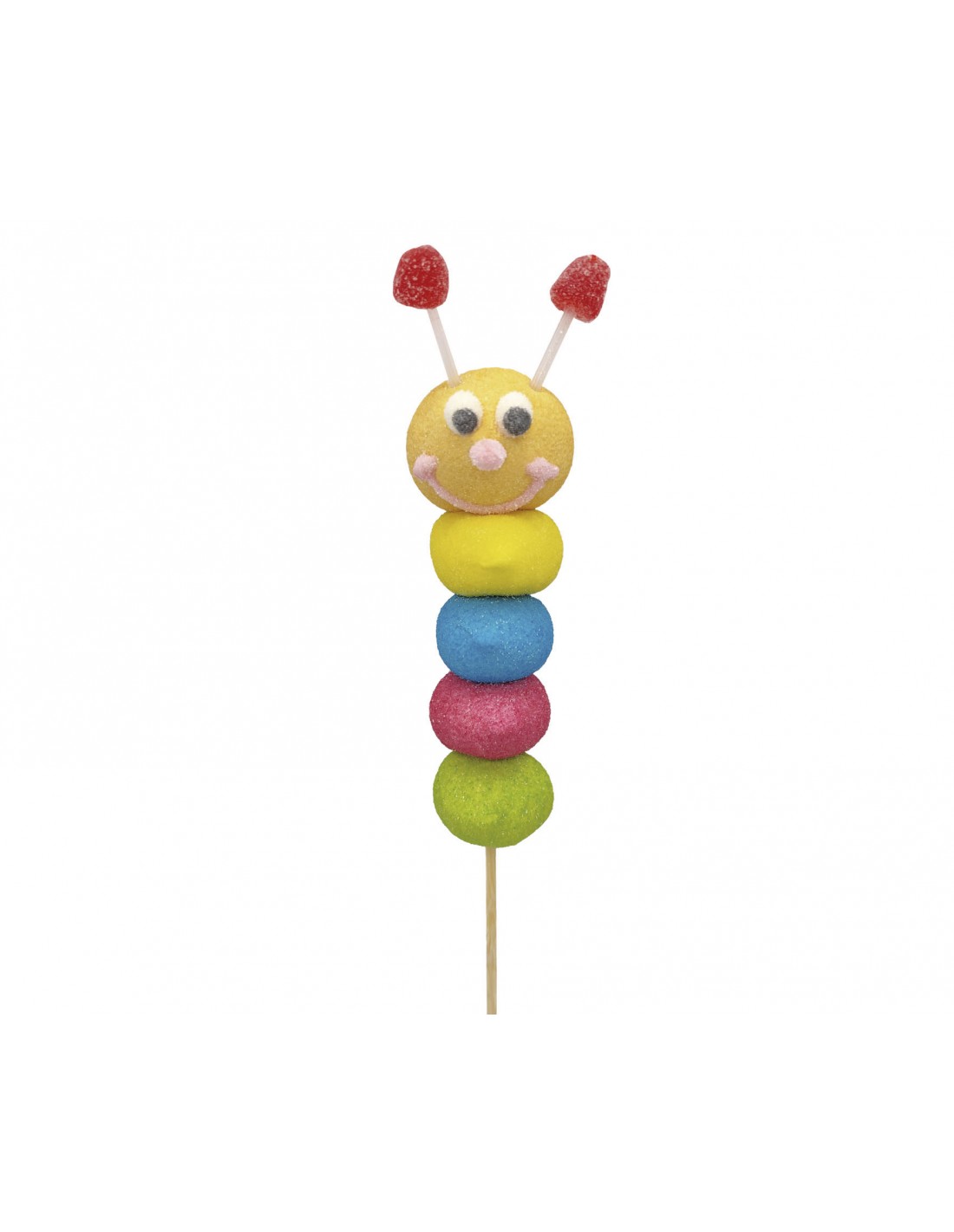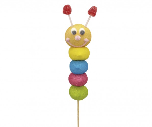 Piruleta con forma de gusano, formada por bolas de marshmallow de colores surtidos, las antenas son dos gomas dulces.