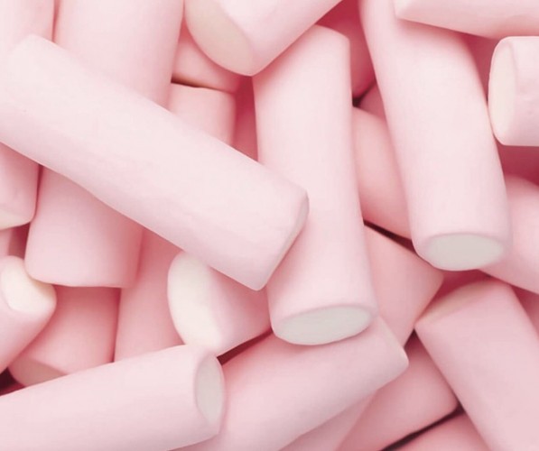Marshmallow esponjosos y dulces, de color rosa en el exterior y blanco en el interior, ideales para decorar tartas y mesas dulces, perfectas para fiestas y celebraciones.