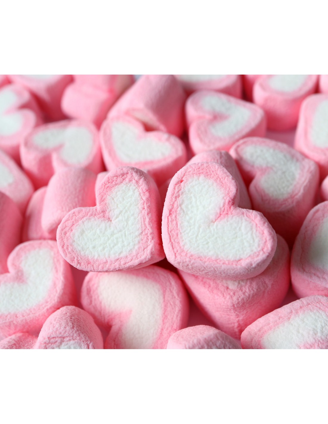 Marshmallow esponjosos y dulces, con forma de corazón, de color rosa y blanco, ideales para decorar tartas y mesas dulces, perfectas para fiestas y celebraciones.