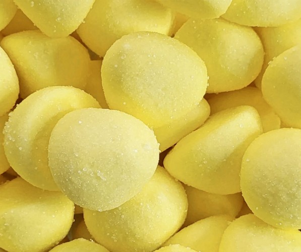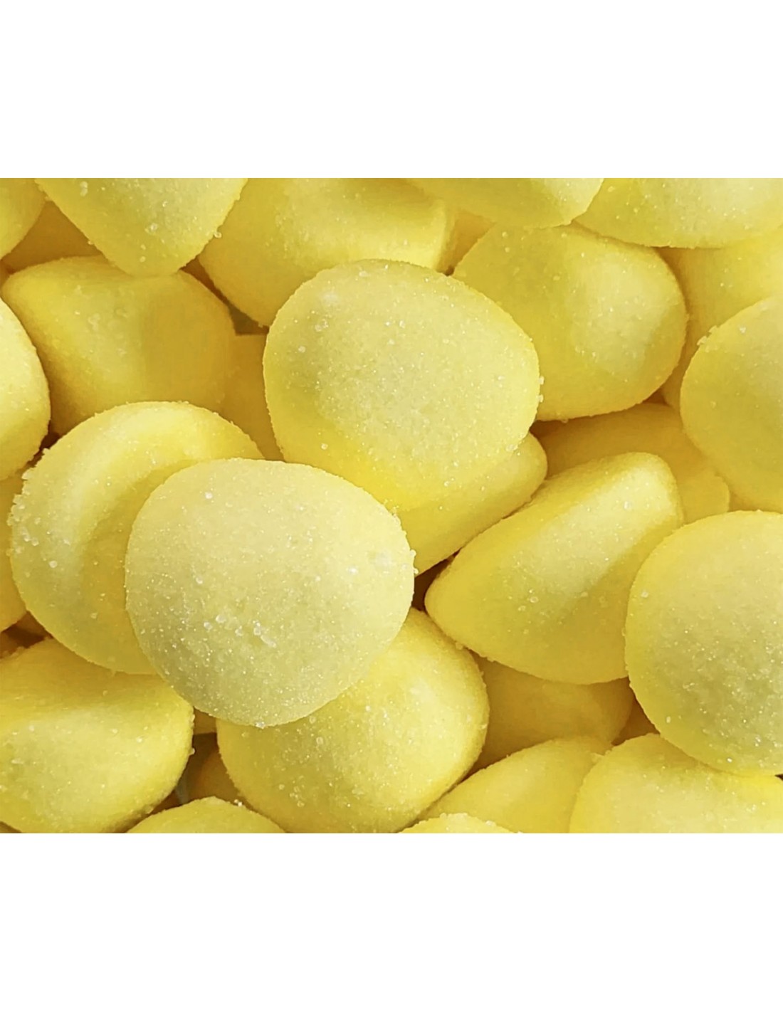 Marshmallow esponjosos y dulces, de color amarillo, ideales para decorar tartas y mesas dulces, perfectas para fiestas y celebraciones.