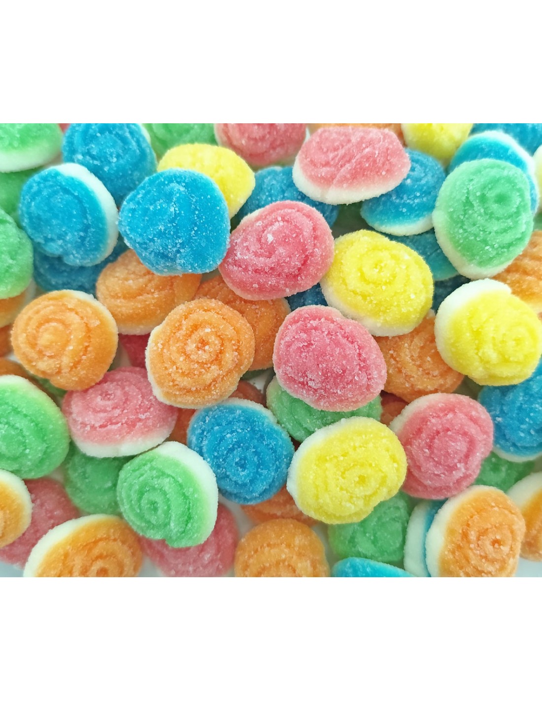Gomitas dulces y sabrosas, con forma de flor, de colores y sabores surtidos, ideales para decorar tartas y mesas dulces, perfectas para fiestas y celebraciones.