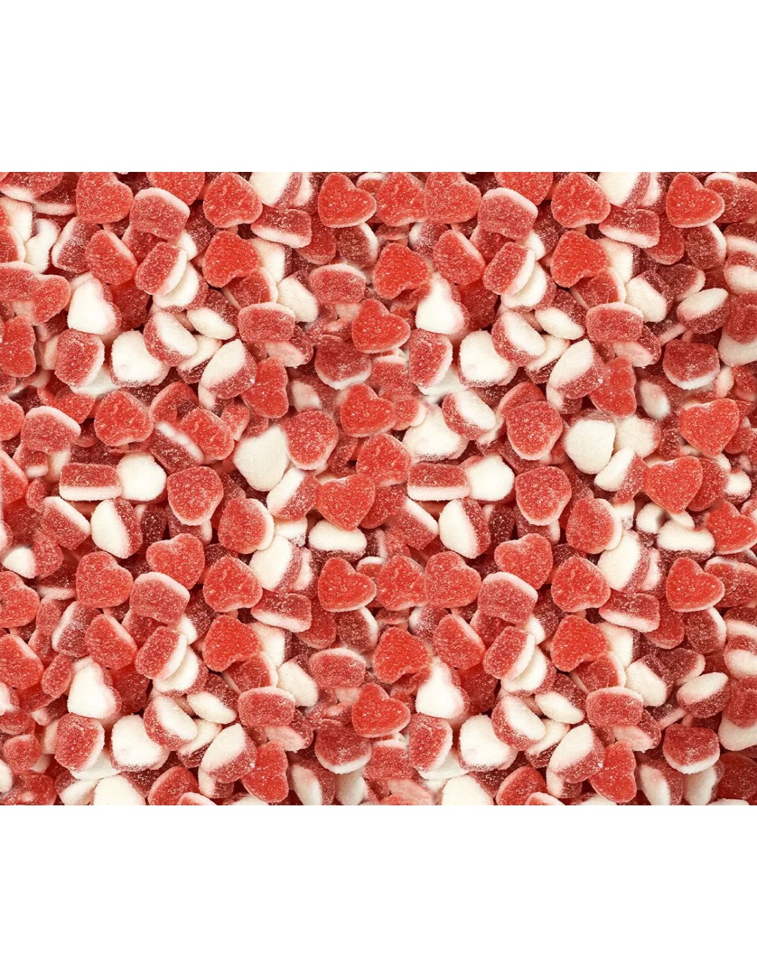 Gomitas dulces y sabrosas, con forma de corazón, de color rojo y blanco, ideales para decorar tartas y mesas dulces, perfectas para fiestas y celebraciones.