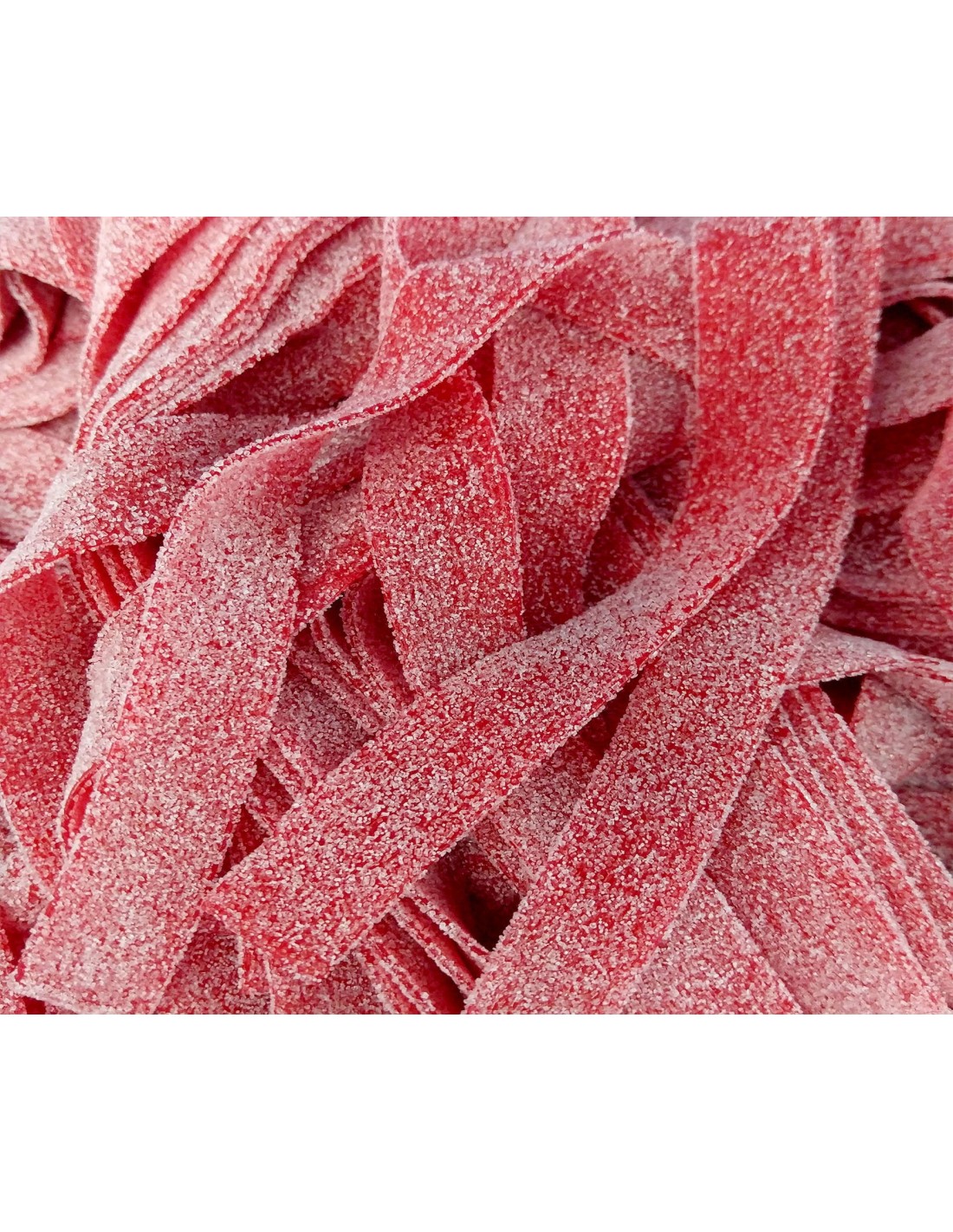 Gomitas dulces y sabrosas, con forma de cinta, de color rojo y sabor a fresa, ideales para decorar tartas y mesas dulces, perfectas para fiestas y celebraciones.